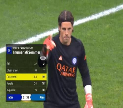 事实上赛前转播商DAZN还公布了一组本赛季意甲门将阻止对手预期进球的数据,其中米兰队长迈尼昂以7.7球高居榜首,罗马门将斯维拉尔则是7.4球位居第二。而索默在这项数据上却是尴尬的-1.3,这意味着他甚至还让对手进了更多的球。